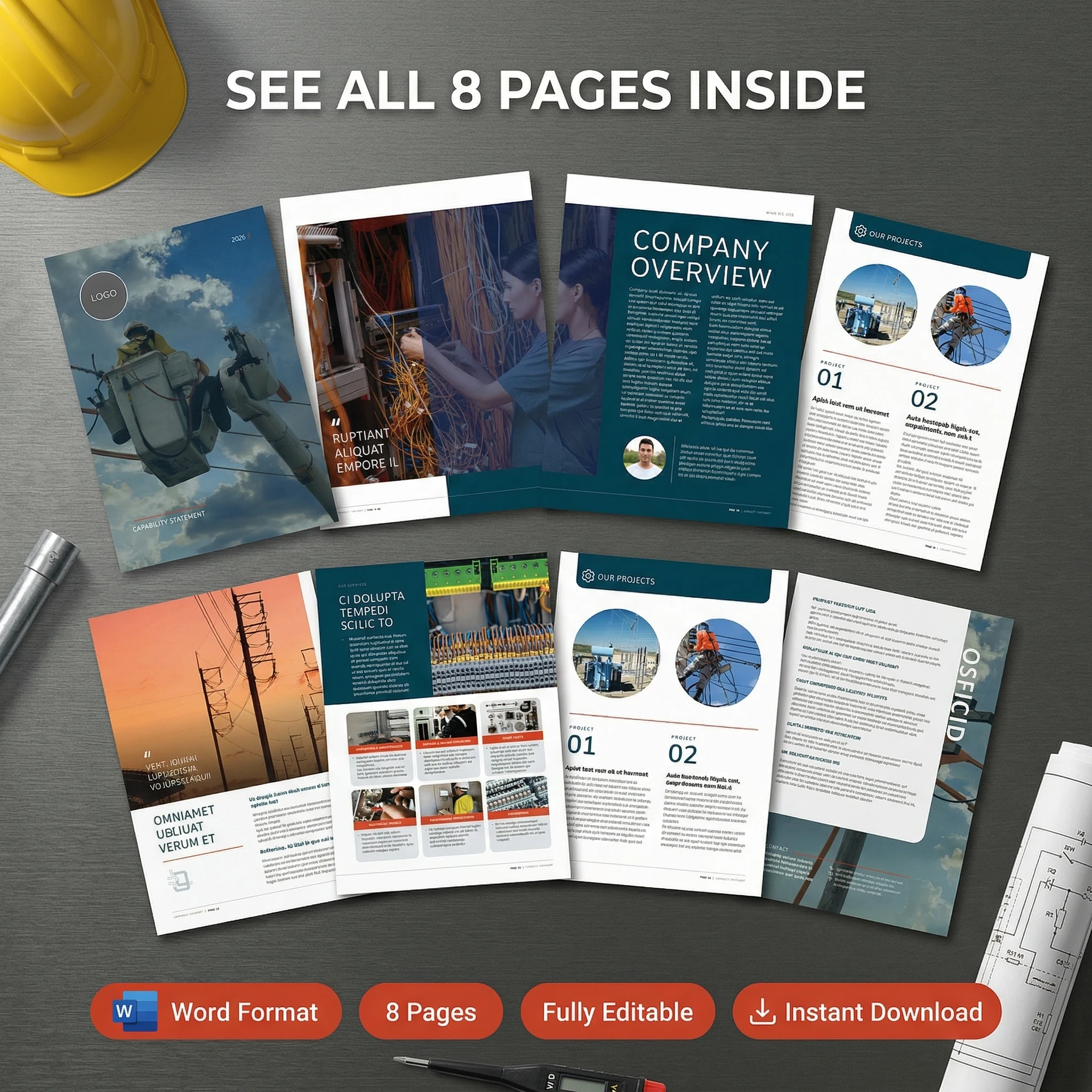 Available in Microsoft Word format, you can drop in your logo, swap out images, update colours to match your branding, and change icons to suit your services. Whether you specialise in switchboard upgrades, data and communications cabling, solar installations or industrial maintenance, the template adapts to your business. No design skills needed. A handy User Guide & Editing Instructions document walks you through the whole process step by step.