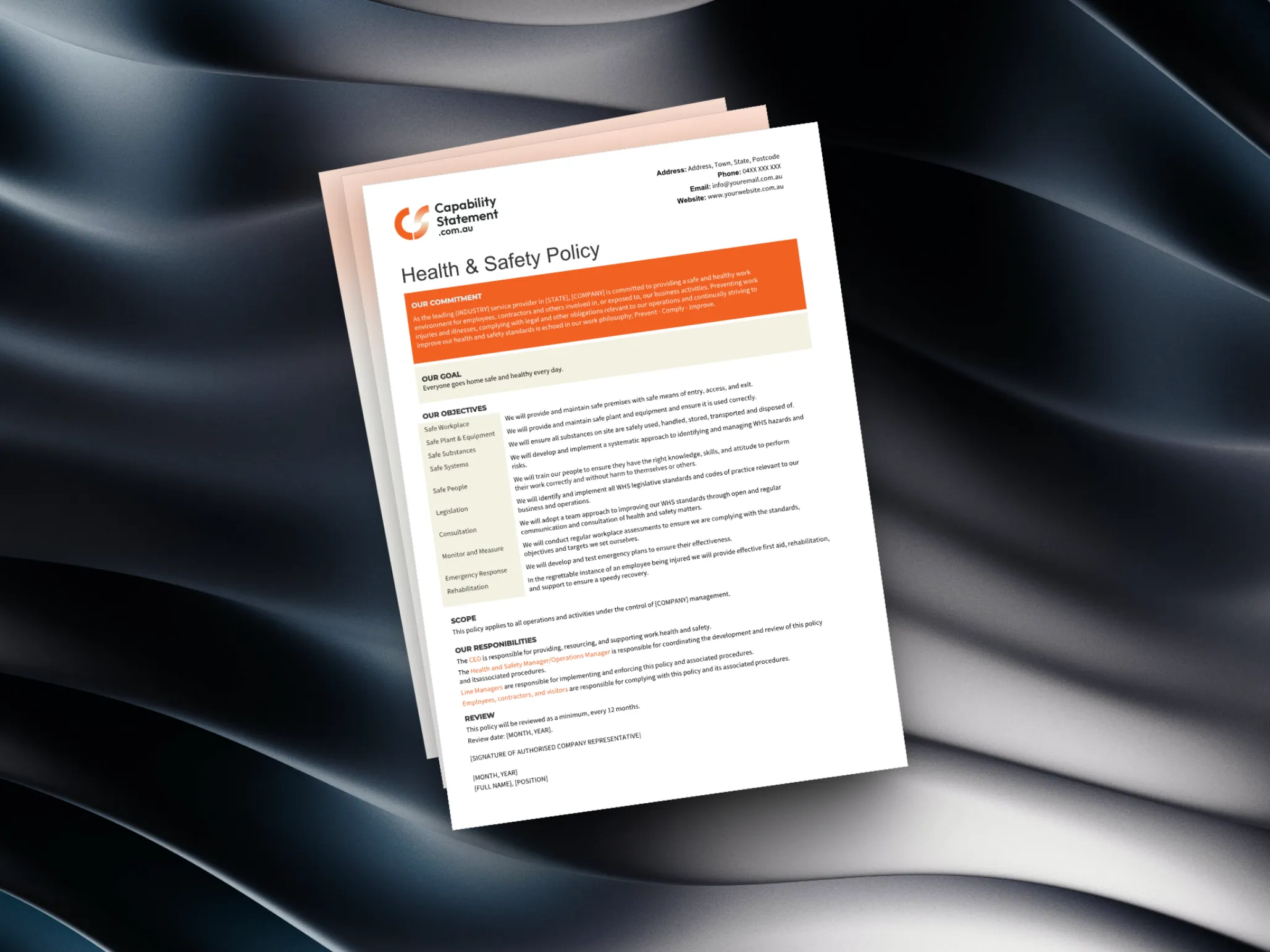 - Clear declaration of your organisation’s commitment to health and safety, suitable for senior management signature.