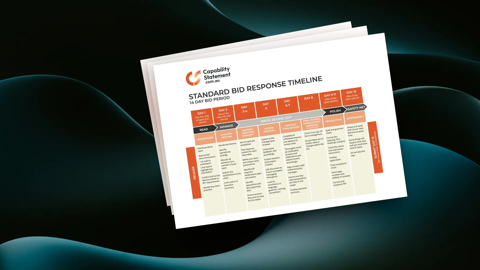 These timelines also work for proposals, RFQs, expressions of interest, pre-qualification applications, and any structured business response requiring planning.